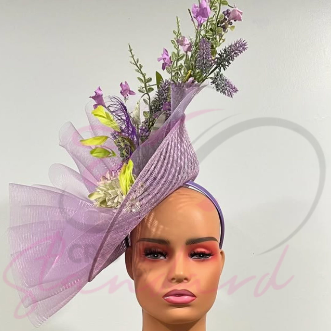 Add a touch of elegance to your ensemble with this exquisite lavender fascinator, adorned with delicate feathers and charming flowers. Perfect for weddings or special occasions, this accessory enhances any outfit with its sophisticated flair.
