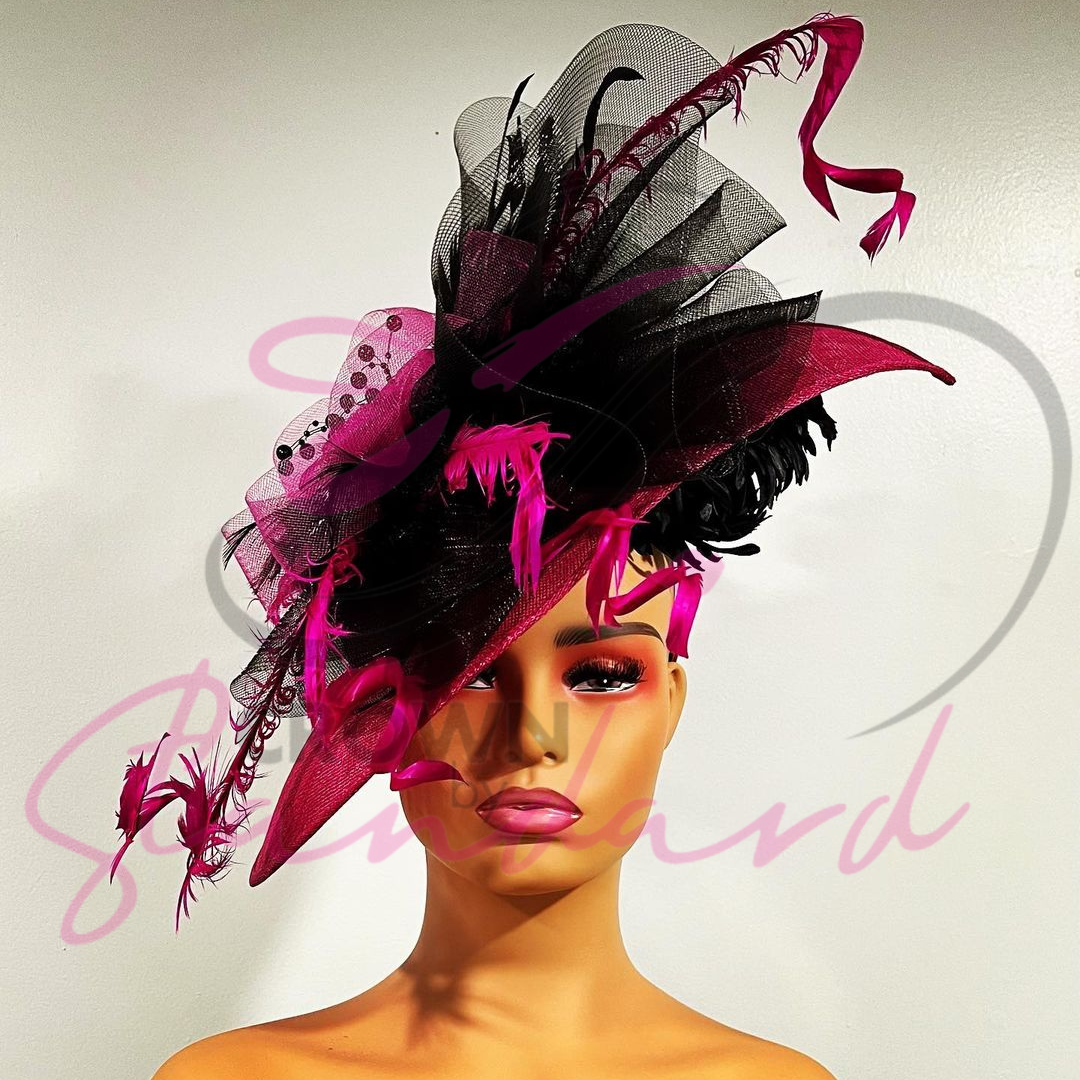 Yellow hat with a huge purple silk abaca bow and feathers!