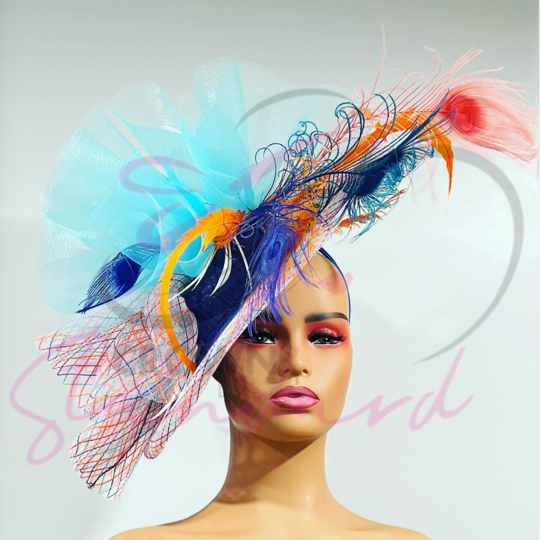 This multiple color fascinator in blue, orange, a touch of red and white. It's ready for your next special event!