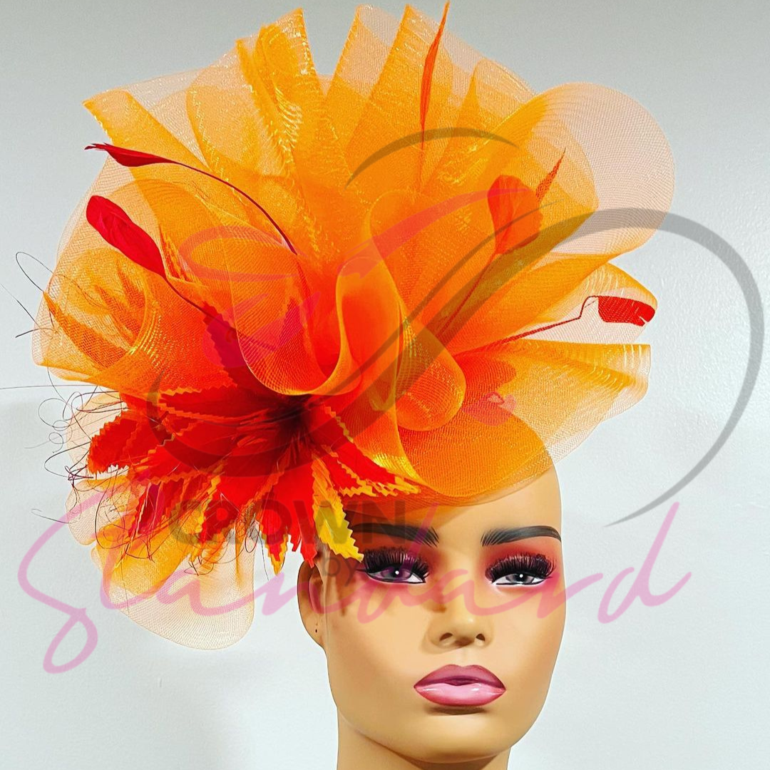 Introducing an exquisite fascinator crafted with an orange crinoline base and embellished with a captivating combination of red and orange feather flowers.