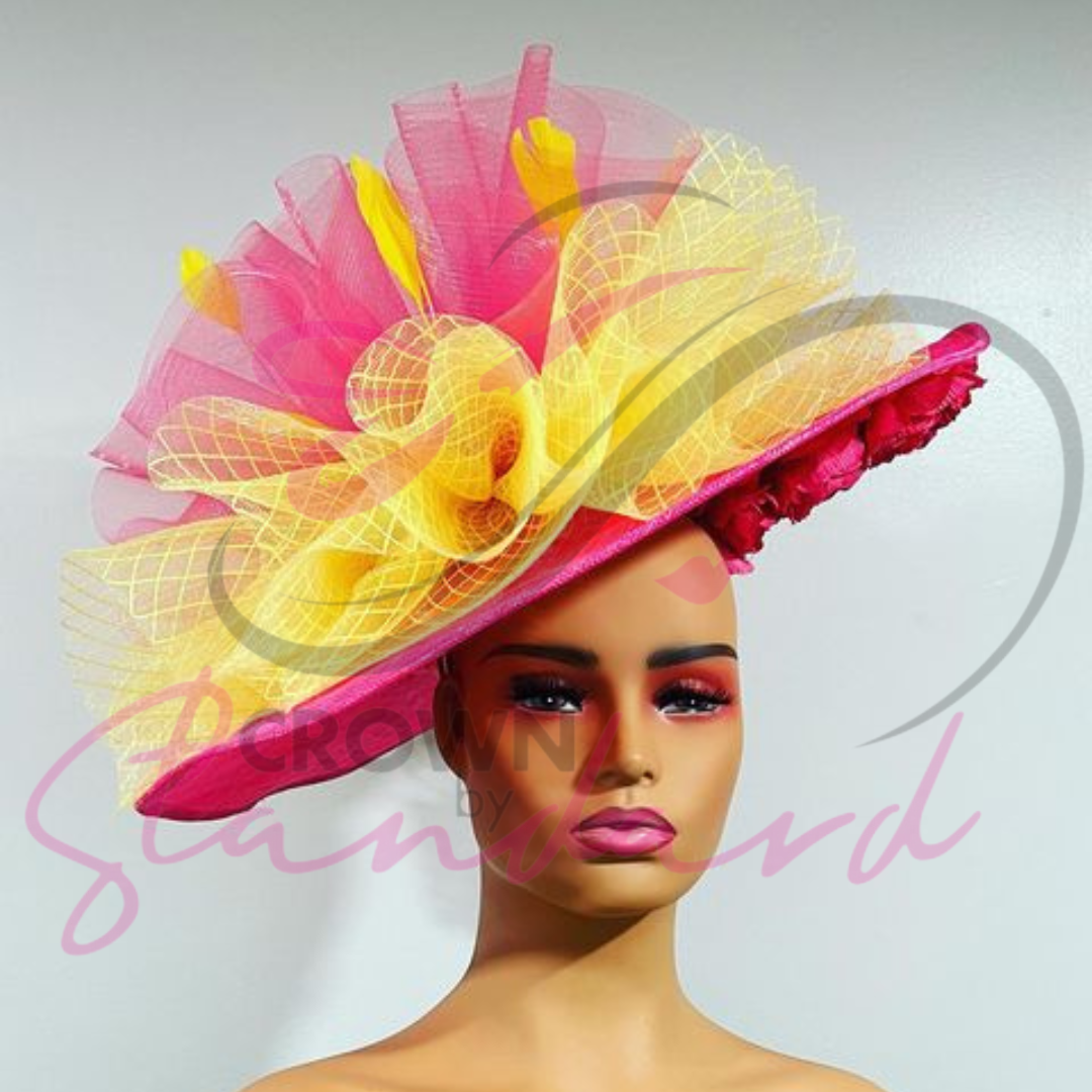 This fascinator features pink flowers that are complemented by vibrant yellow and pink crinoline, creating a stunning contrast that is sure to catch the eye.