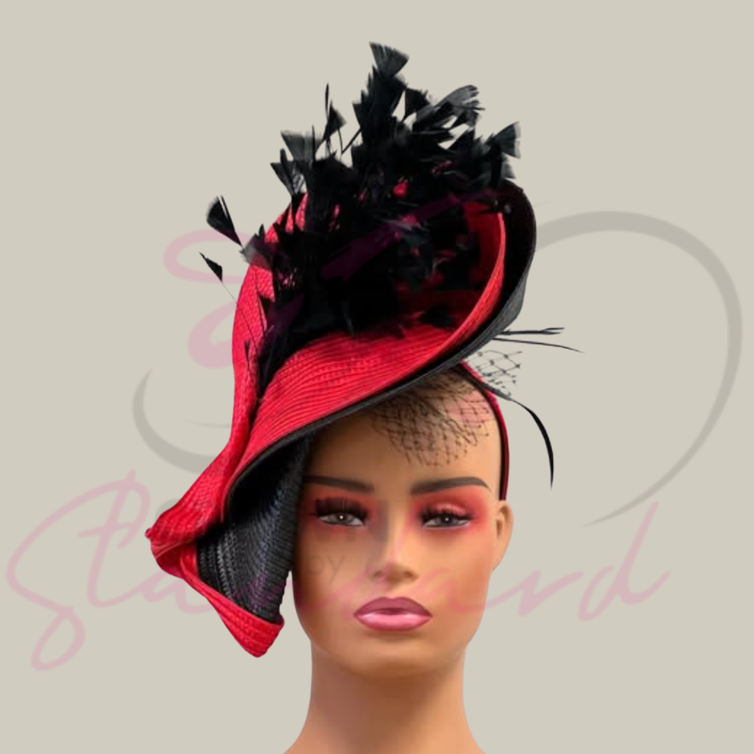 Enhance your style with this striking red and black fascinator, adorned with elegant feathers. Perfect for any occasion, this accessory adds a touch of sophistication to your ensemble.