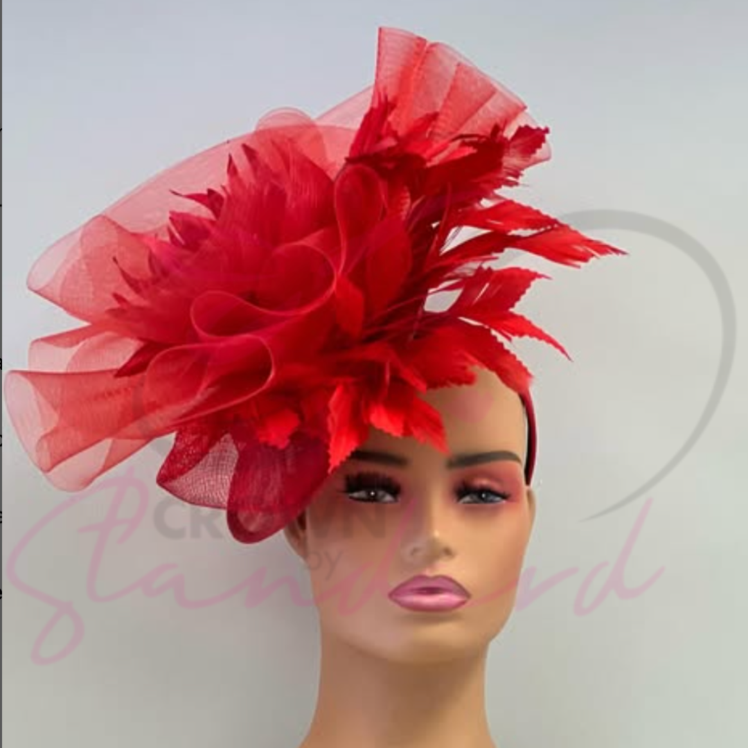 Turn heads with this striking red fascinator, featuring a feather flower and elegant crinoline. Perfect for any special occasion, this accessory adds a touch of glamour and sophistication to your ensemble.