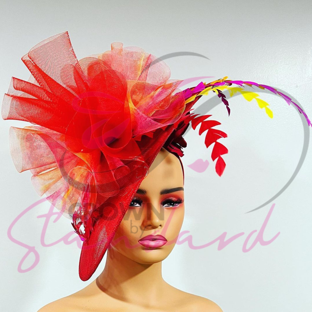 Crafted from high-quality materials, this fascinator features a beautiful red base adorned with playful multicolored crinoline and delicate feathers.