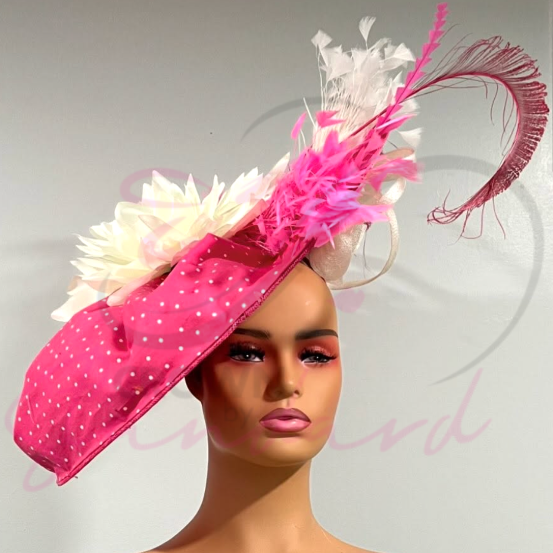 This is a gorgeous Pink and white fascinator with a polka dot pattern and pink and white feathers.