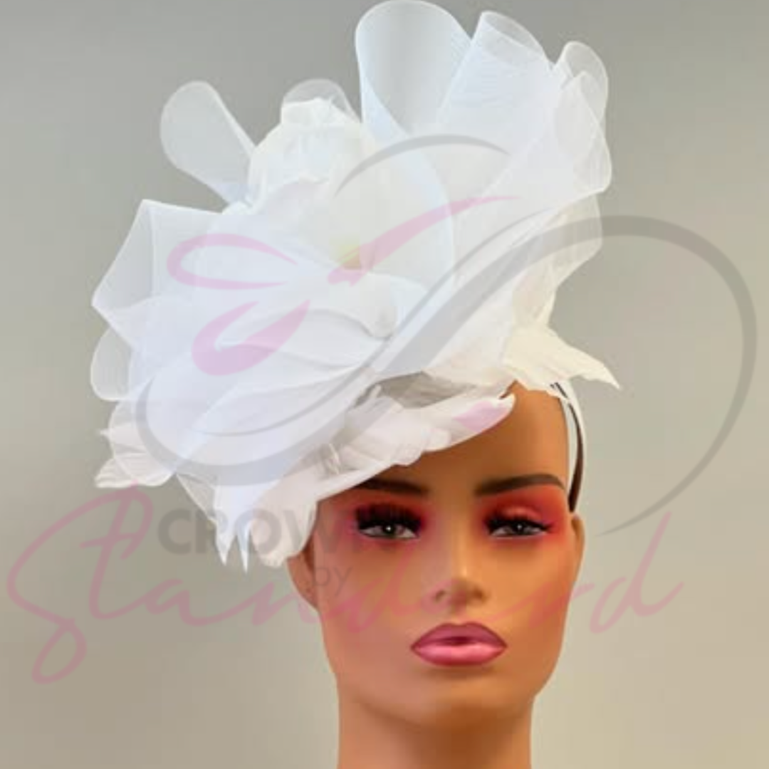 Elevate your ensemble with this elegant white fascinator, adorned with delicate feathers. Perfect for any special occasion, this accessory adds a touch of sophistication to your outfit.