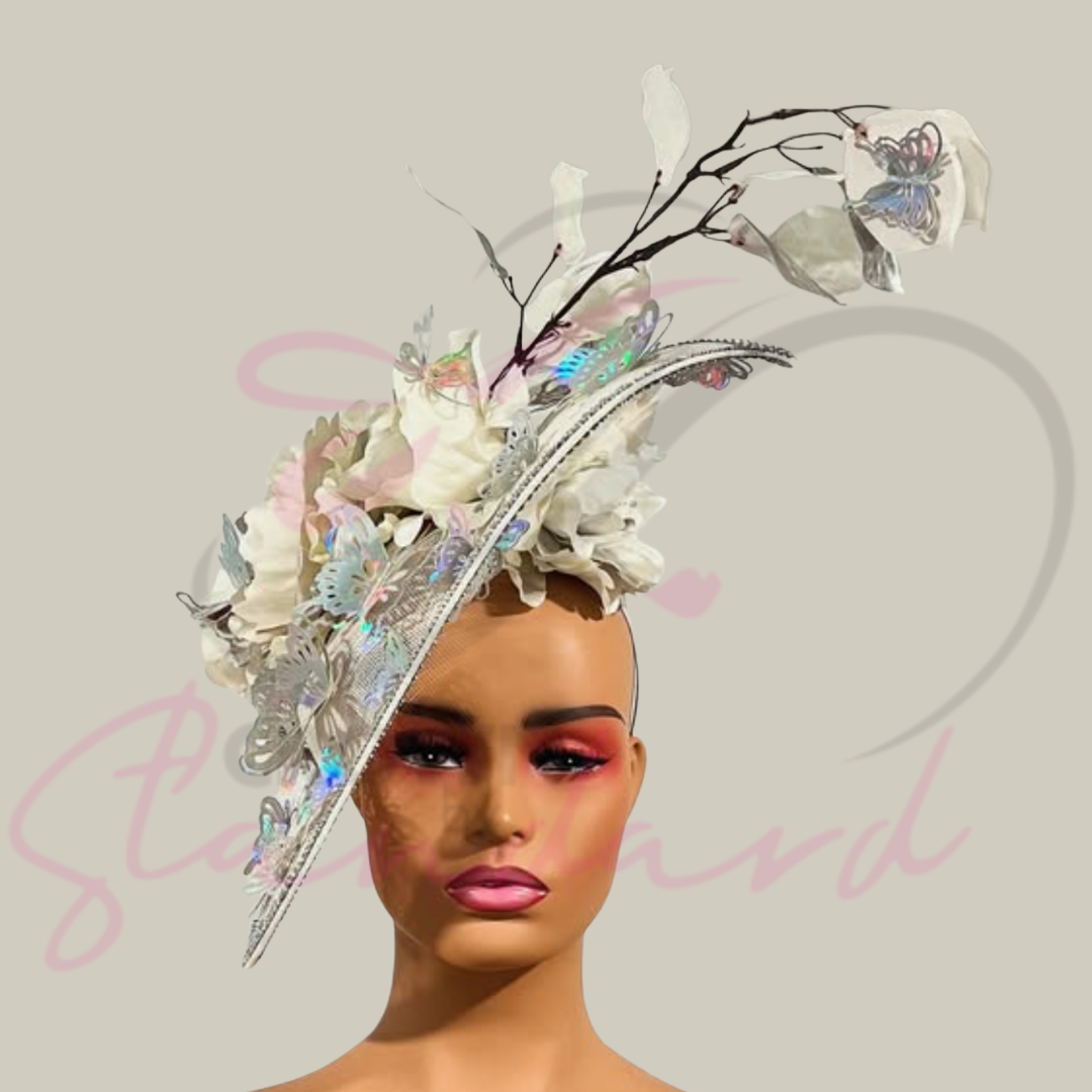 White fascinator with silver and white flowers that are surrounded by many beautiful silver butterflies!