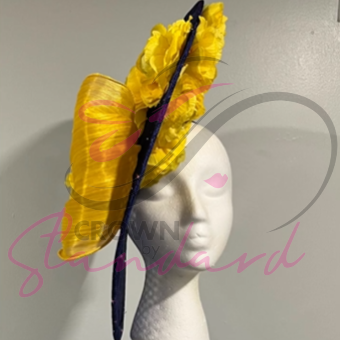 Our Yellow-flowered Blue Sinamay Fascinator is sure to get you noticed at any occasion. This beautiful floral crown features bright yellow blossoms and sophisticated blue Sinamay.